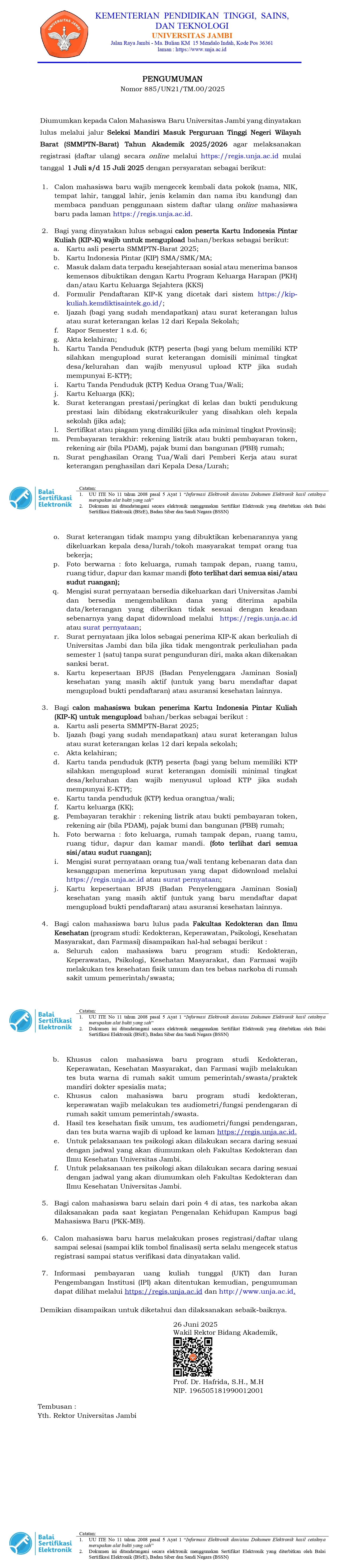 Diumumkan kepada mahasiswa baru yang lulus jalur SMMPTN-BARAT 2025 agar dapat melaksanakan daftar ulang dari tanggal 1 Juli s/d paling lambat 15 Juli 2025.